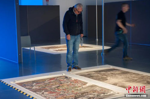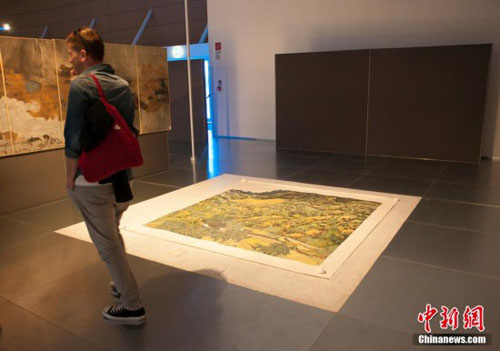 当地时间5月28日,意大利威尼斯,2015米兰世博会——威尼斯水馆内的意中联合馆推出了一批中国传统的字画作品,引得当地游客驻足观看。
