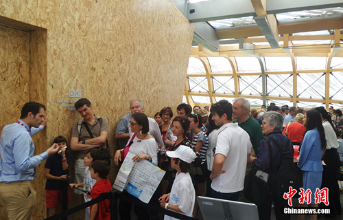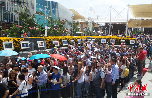 当地时间5月30日,意大利米兰,2015米兰世博会北京周活动现场迎来大批参观者,中国馆内精彩纷呈的表演吸引了众多对中国文化感兴趣的游客。他们在中国馆前顶着烈日排起长队,等待观看独具中国魅力的各类表演。 中新网记者 李卿 摄