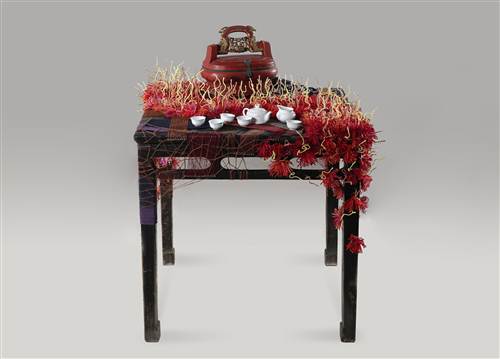 《舞》的设计者是川美青年教师张海东。他向记者介绍,《舞》中的八仙桌来自虎溪某户农家不要的“废品”。“我把残破的八仙桌进行修补后,用毛线、金属等材料对它进行修饰。”