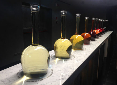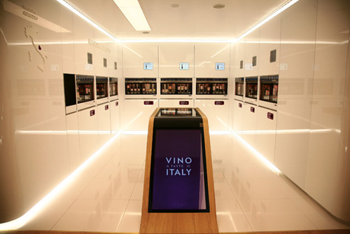 沿着旋转楼梯到达二楼,就此进入意大利葡萄酒的现代世界。葡萄酒们挨个规整地陈列在墙上的冰柜内,一眼望去满满都是酒瓶,每一瓶酒都连接着不锈钢饮用管。从意大利北部的皮埃蒙特产区,到中部的托斯卡纳产区,再到阳光明媚的南部西西里岛产区,具有代表性的葡萄酒齐齐出现在这里。