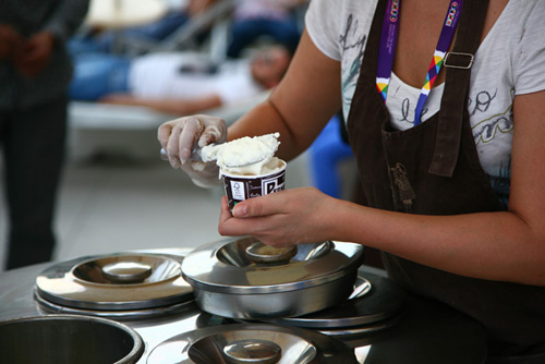 不少参观者脖子上都挂着紫色袋子——里面是个印有米兰世博会暗纹的葡萄酒杯,10 欧元一张试酒券,可以选择三种葡萄酒尝试。扫描试酒券上的二维码就能选择相当于标准杯量的葡萄酒,酒入杯中还是冰的,保证最佳品尝状态。