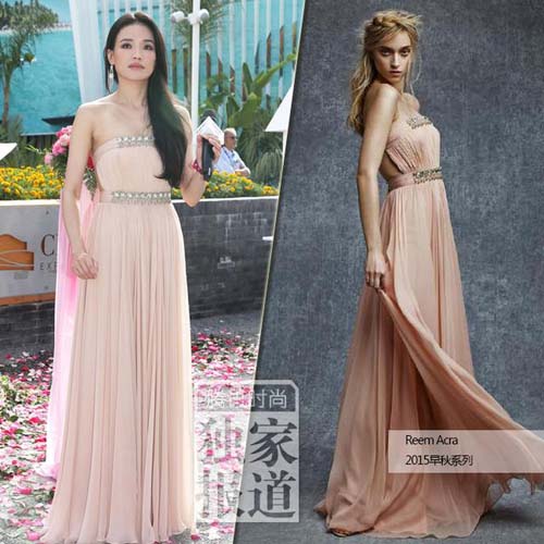女神舒淇以一身粉色雪纺裹胸礼服亮相米兰2015世博会MAYSU展台,胸前和腰间的珍珠拼贴很美呢。 舒淇身穿的礼服是Reem Acra 2015早秋系列,尽显女神风范。