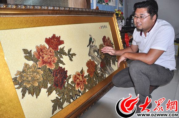 韩国瑞向大众网记者介绍他的作品《花开富贵》