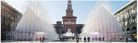 图片:米兰官方在市中心著名的斯福采斯科城堡前专设世博之门,大街两旁竖起147个参展国家和国际组织的旗帜,营造世博气氛。