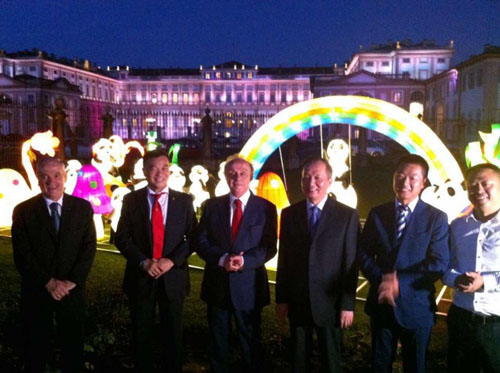 四川文化旅游服务贸易推介会日前在米兰世博会中国企业联合馆召开,憨态可掬的熊猫、胖嘟嘟的年画娃娃、威尼斯面具Bauta脸谱、比萨斜塔等30余个大型彩灯前夜在蒙扎意大利皇宫花园亮灯。