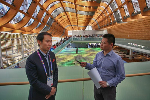米兰世博会中国馆副馆长阮炜接受人民网强国论坛记者采访。(周鹏 摄)