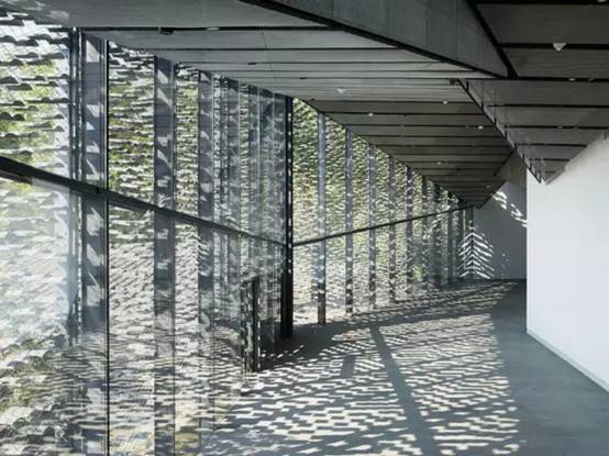 博物馆用大面积的落地玻璃取代了冷冰冰的水泥墙将建筑更好的隐藏了起来。随着时间的游走光线会慢慢逛遍展馆的每一个角落。