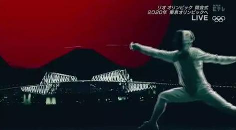 在击剑选手背后,是富士山和被称为“恐龙桥”的东京京门大桥。
