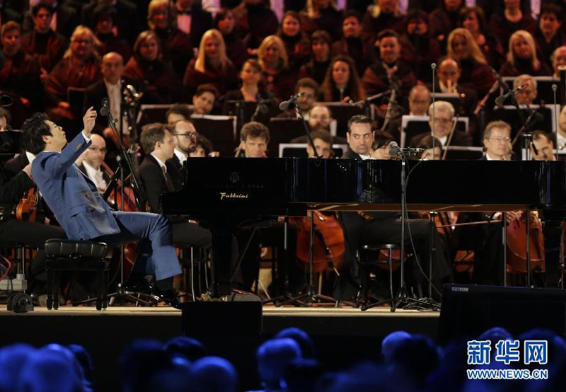 4月30日,在意大利米兰大教堂前的多莫广场举行的2015米兰世博会开幕晚会上,中国钢琴家郎朗演奏《春节序曲》和《土耳其进行曲》。 新华社记者叶平凡摄