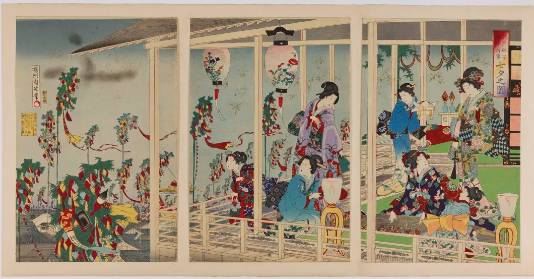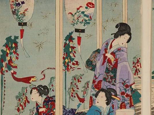 七夕在奈良时代传入日本,江户时代则扩大到民间。这幅《江户砂子年中行事 七夕之图》,描绘了七夕时节女子祈福的情景。
