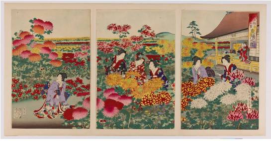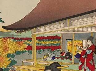 日本的重阳节于平安时代由中国传入。平安时代起,日本贵族每逢农历九月初九便在宫中办赏菊宴,产生了在重阳节赏菊花、喝菊花酒的风俗。这幅《江户砂子年中行事 重阳之图》,便展示了重阳节时女子身着华美衣服赏菊的情景。