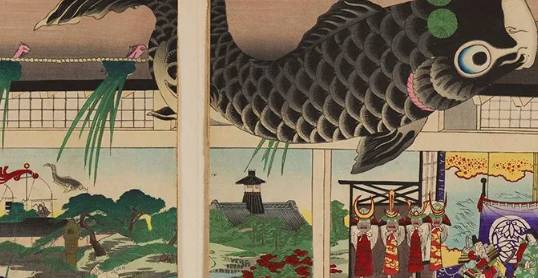 江户时代中期,民间开始流行悬挂鲤鱼旗(图右上方),取“鲤鱼跃龙门”之意,祝福男孩茁壮成长、奋发向上、出人头地,于是,端午节的习俗被赋予了新的文化,演变成菖蒲节、男孩节。值得一提的是,明治维新后,端午节从阴历改为阳历五月五日,并被定为日本的儿童节。