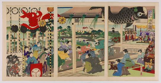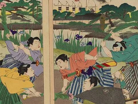 在日语中,“菖蒲”与“尚武”一词的发音相同,且菖蒲的叶子形状与剑的形状相似,因此我们可以从图左侧看到众男孩手持菖蒲制作的剑进行竞赛,意在祈愿男孩身体健康。