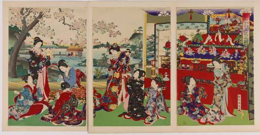 在《浮世万象——百幅浮世绘艺术珍品展》中,便有一幅题为《江户砂子年中行事 上巳之图》的展品,描绘的便是五节句中三月三日女儿节的情景。