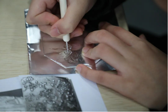 使用锡纸画来模拟银器錾刻工艺,在制作中感受外销银器纹样的雅趣和海丝之路上的中西融合。