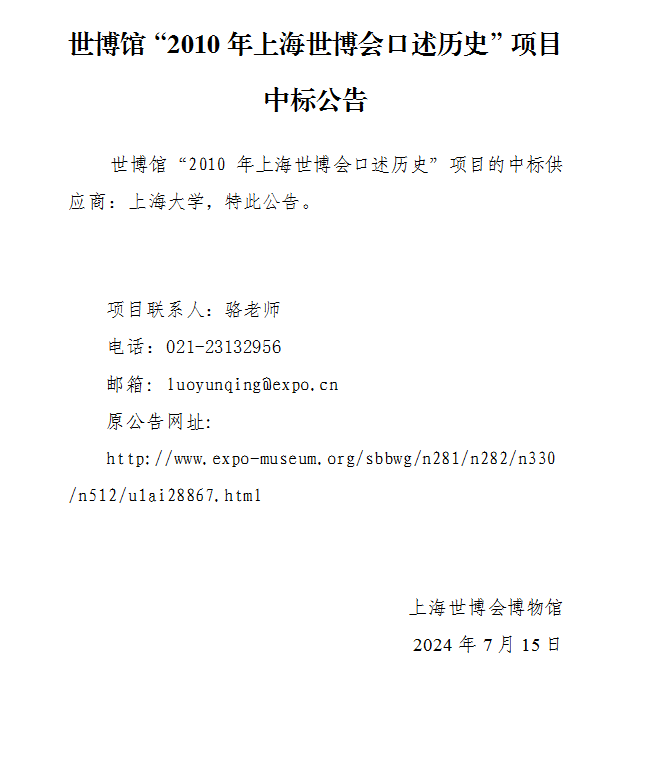 世博馆“2010年上海世博会口述历史”项目中标公告