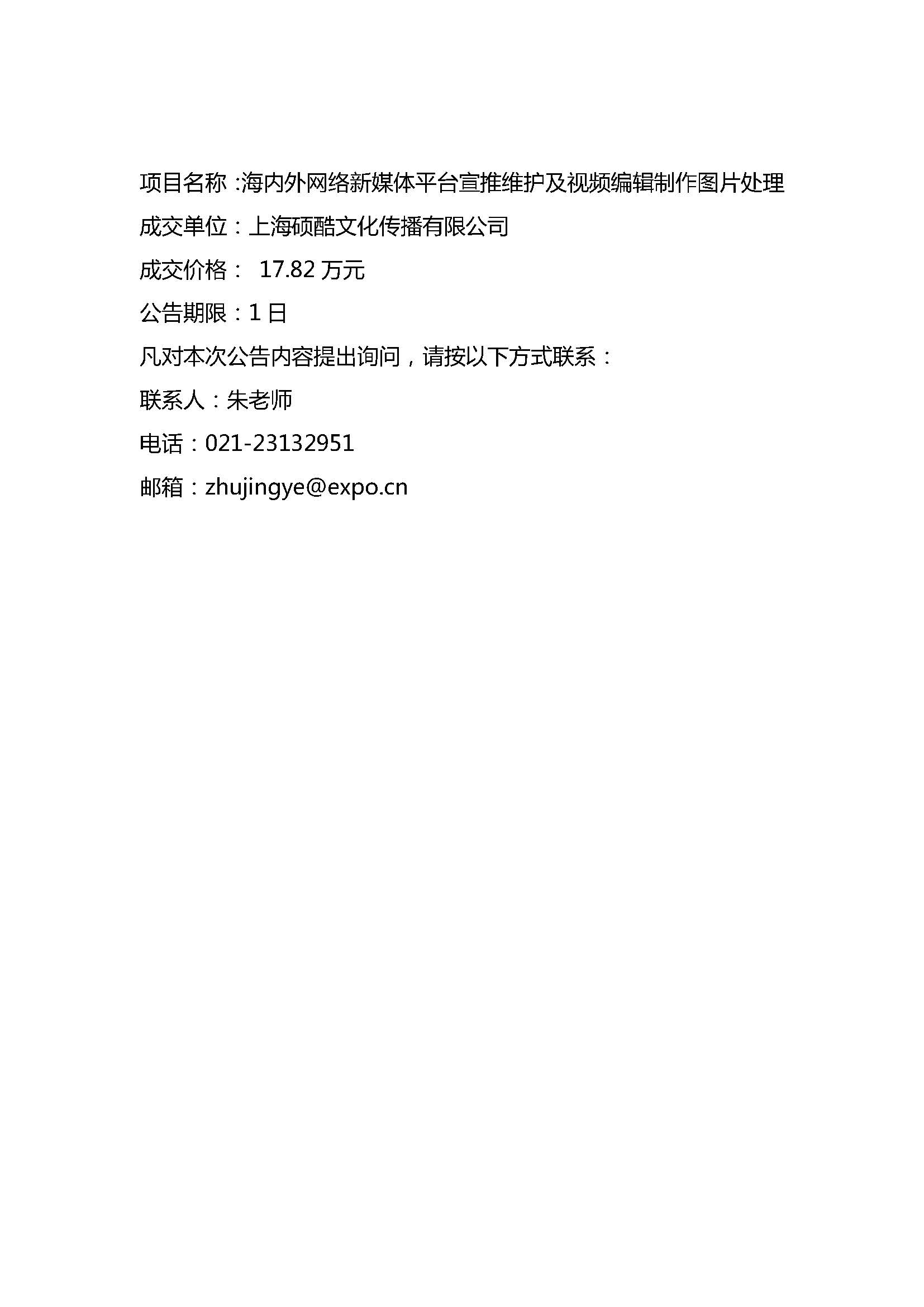 世博会博物馆海内外网络新媒体平台宣推维护及视频编辑制作图片处理项目采购结果公告