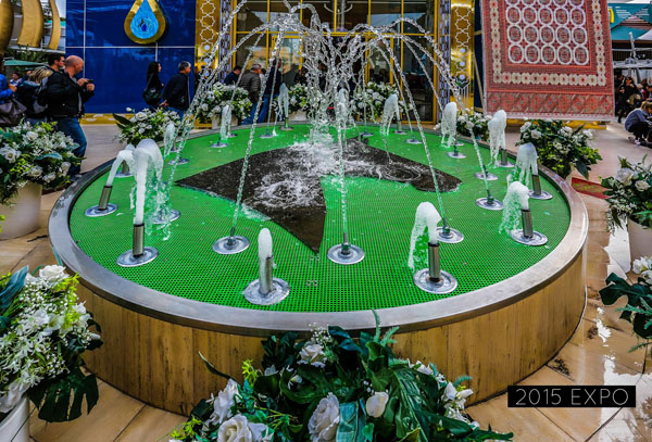 At expo2015, the Turkmenistan Pavilion displays traditional as well as modern symbols of its country. At the entrance of the white pavilion, there is a water fountain with a horse’s head of the oldest known horse breed in the world, the “Ahal-Tekke horse”. Inside the solid construction, visitors will find the theme of quality food production, biodiversity and health, even huge hand made carpets, a water feature with projection, a 5D cinema and a genuine traditional yurt on the rooftop.