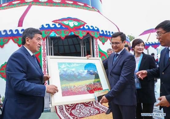 ¡¡¡¡Kyrgyz President Sooronbay Jeenbekov presents a gift to the Chinese side as he visits the Kyrgyzstan Garden at the International Horticulture zone of the International Horticultural Exhibition 2019 Beijing, in Beijing, capital of China, April 28, 2019.(Xinhua/Zhang Yuwei)