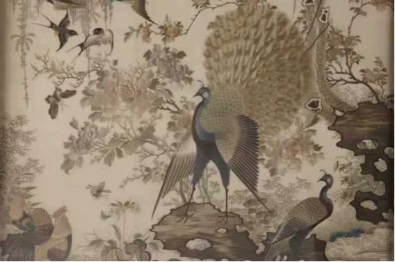 Embroidery absorbed the chiaroscuro and perspective principles of Western oil painting. White Satin Canton Embroidery Screen with the Design of Peacock, Birds and Flowers is fully embroidered with multicolored silk threads, showcasingmeticulous craftsmanship and vivid, lifelike details.