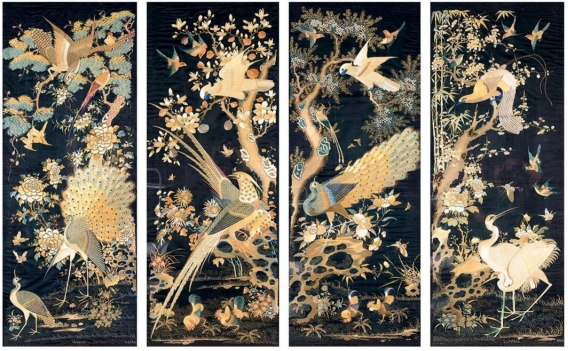 White Satin Canton Embroidery Screen with the Design of Peacock, Birds and Flowers(Detail)