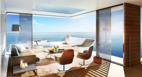 来自Kleindienst Group公司一个美妙得如同天方夜谭的计划,他们打算在阿拉伯湾上建造这些真正的豪宅——近似地,你可以把它们看作是没有动力单元的豪华游艇,但却比游艇更加休闲和环保,也更加私密。每一幢都分为水上和水下两个部分,其中水上部分提供三层甲板,方便朋友们正着晒、反着晒、横着晒、竖着晒,晒完还有按摩浴缸伺候。而室内则提供有豪华的厨房和餐厅,以及一个迷你酒吧。水下部分相对私密,是豪宅主人的卧室,拥有透明的玻璃幕墙,这才是真正的私享海景。