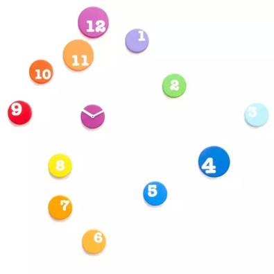 这款钟表和上边的随机数字挂钟来自的灵感,但是刻度小块变成了原型,而且颜色更加鲜亮,让整个表盘看起来立马活泼了不少。挂钟由13个塑料圆盘组成,可在墙上任意摆放,刻度小方块的直径有10cm和13cm两种。