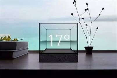 这是Yu Zhuang设计的一款看天气的设备,没错,就是一个小水缸,名为天气魔方Weather Cube。它同时会显示当前时间及温度。水面平静表示晴朗,玻璃上挂满水滴表示下雨。有波浪表示刮风,而蒸汽表示起雾。