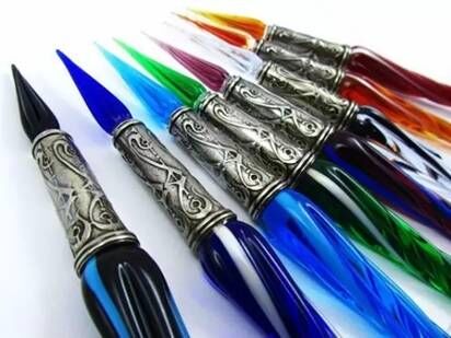 “玻璃笔”,又称为威尼斯玻璃笔,是以毛细管作用为原理,将墨水贮存于笔头上数个沟槽,这些沟槽能将墨水引导到笔尖。书写时出墨量和笔迹线条粗细,是由笔头上贮墨沟槽的深度、宽窄与书写角度所决定。