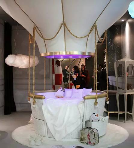 这款床铺由传统的编织工艺制作而成,只有一半的热气球由人造皮革制成,放佛要冲破屋顶,带你飞向蓝天。篮子中的床铺同样可用作沙发,底部设计有抽屉,可以存放玩具。整体白色看上去干净纯真,一定带给宝贝儿们一个美妙的梦境。