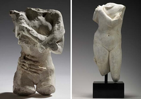 罗丹创作的《手骨搭在腹部的女性上半身》(左)及给了他灵感的残破女性人体石雕收藏品(右)。