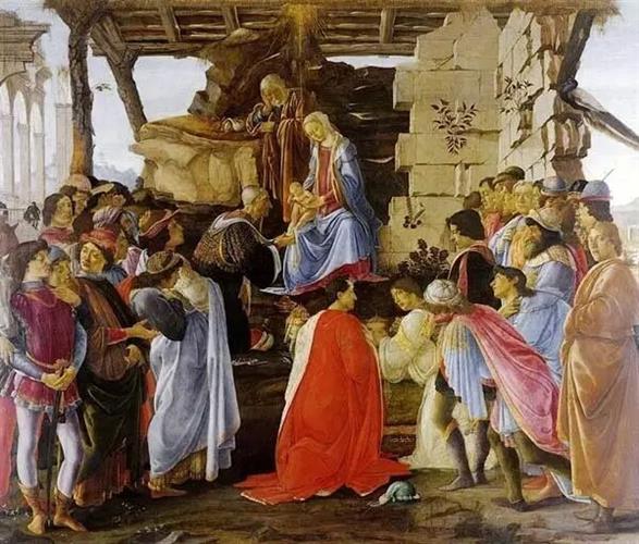 波提切利这幅基督教的经典题材《三博士来朝》出现了很多人物,其中主要人物都是由美第奇家族的成员扮演。