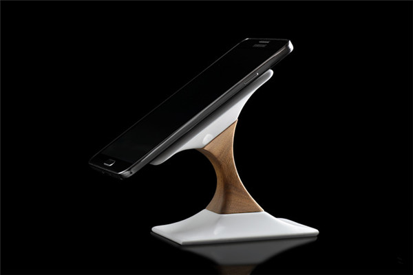 为了使充电支架尽可能的自然而富有特色,最佳的选择是选用可持续的材料,考虑到高品质极致体验,设计师选用了美国黑胡桃木和陶瓷材料作为「Swich」的材料,结合胡桃木笔直的纹理和陶瓷圆润的质感,在视觉上给人强烈的冲击。此外,为了避免手机在支架上滑落,设计师尝试了各种材料,最后发现亚克力泡棉板最适合用在吸盘上。