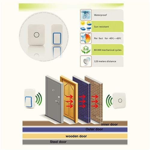Vgate 无线防水门铃是一款不是由电池提供动力的具有超强防水功能的无线智能门铃。Vgate 无线防水门铃通过按动门铃上的按钮,把用户施加的动能转化为一个电信号,然后接收器接收到这个信号,就会发出铃声和灯光闪烁。Vgate 无线防水门铃发射机内部组件采用IPX7的防水材质和ABS塑料材料,所以即使在水中长时间的浸泡,门铃仍能运转良好。Vgate 无线防水门铃的安装使用简单方便,用户只需在门上用螺钉或者胶垫安装上门铃发射器,然后在室内放置接收器就可以了。